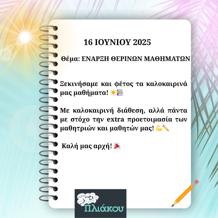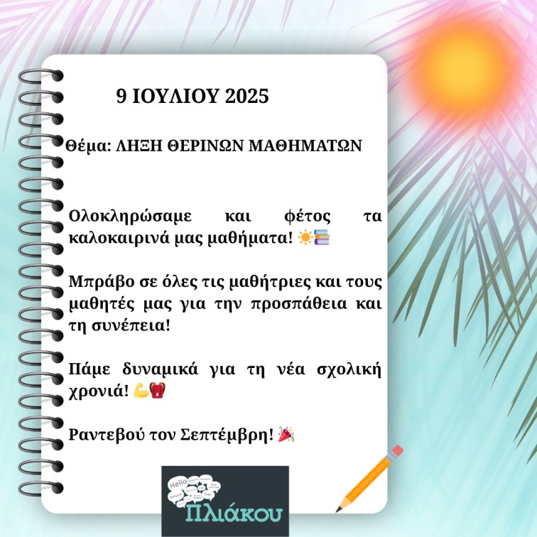 📌 Είναι ώρα τώρα να κλείσουν τα βιβλία, να αδειάσουν οι τάξεις και να ξεκουραστούν οι μαθήτριες κι οι μαθητές που ολοκλήρωσαν το καλοκαιρινό τμήμα που επέλεξαν. Ανανεώνουμε το ραντεβού μας για τη Δευτέρα 1η Σεπτεμβρίου και συνεχίζουμε πιο δημιουργικά …